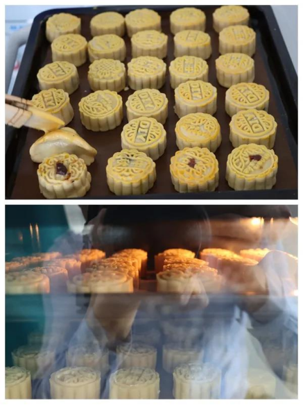 在月饼表层刷上全蛋液,再放烤箱,烤个20分钟,就可以拿出来了。