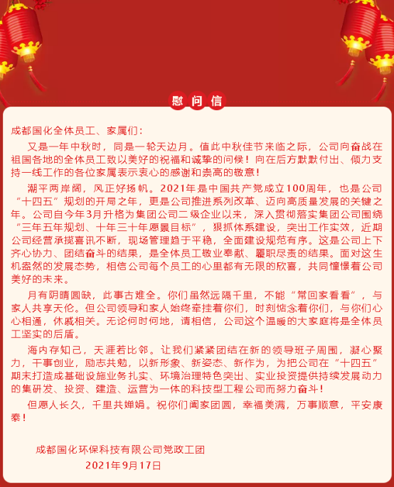 又是一年中秋、国庆“双节”来临之时,但在万家团圆共赏一轮明月之时,成都国化的建设者依旧在坚守岗位,奋斗在一线。为庆祝传统佳节,深化职工普惠性服务,增强公司凝聚力,成都国化工会开展了“双节”职工关爱活动,具体慰问活动方式是向每一位员工家属寄送一份节日礼物和慰问信,让全体员工感受到成都国化这个大家庭的温暖。寄出一封信,传递一份祝福,送上一份礼物,传递一份温暖。