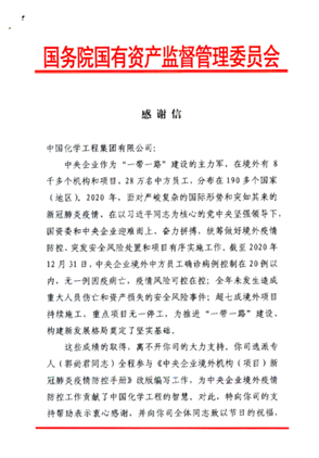 国务院国资委感谢信指出,2020年,面对严峻复杂的国际形势和突如其来的新冠肺炎疫情,在以习近平同志为核心的党中央坚强领导下,国资委和中央企业迎难而上、奋力拼搏,统筹做好境外疫情防控、突发安全风险处置和项目有序实施工作。截止至2020年12月31日,中央企业境外中方员工无一例因疫病死亡,疫情风险可控在控;全年未发生造成重大人员伤亡和资产损失的安全风险事件;超七成境外项目持续施工,重点项目无一停工,为推进“一带一路”建设、构建新发展格局奠定了坚实基础。这些成绩的取得,离不开中国化学的大力支持。此外,中国化学选派专人全程参与《中央企业境外机构(项目)新冠肺炎疫情防控手册》改版编写工作,为中央企业境外疫情防控工作贡献了中国化学的智慧。