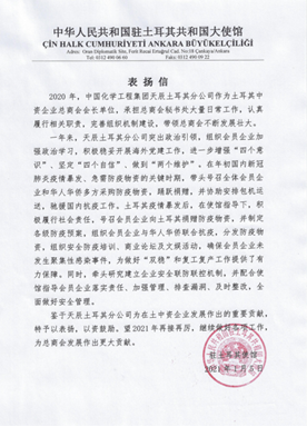 中国驻土耳其共和国大使馆表扬信指出,在年初国内新冠肺炎疫情暴发、急需防疫物资的关键时期,中国化学天辰土耳其分公司带头号召全体会员企业和华人华侨多方采购防疫物资,踊跃捐赠,并协助安排包机运送,驰援国内抗疫工作。土耳其疫情暴发后,在使馆指导下,积极履行社会责任,号召会员企业向土耳其捐赠防疫物资,并制定各级防疫预案,组织会员企业与华人华侨联合抗疫,分发防疫物资,组织安全防疫培训、商业论坛及文娱活动,确保会员企业未发生聚集性感染事件,为做好“双稳”和复工复产工作提供了有力保障。同时,牵头研究建立企业安全联防联控机制,并配合使馆指导会员企业落实责任、加强管理、排查漏洞、及时整改,全面做好安全管理。