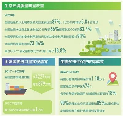 2020年,全国地级及以上城市优良天数比例达到87%,比2015年增长5.8个百分点;PM2.5未达标地级及以上城市平均浓度达到37微克/立方米,比2015年下降28.8%;全国地表水优良水体比例由2015年的66%提高到2020年的83.4%,劣Ⅴ类水体比例由2015年的9.7%下降到了2020年的0.6%;全国受污染耕地安全利用率和污染地块安全利用率双双超过90%;全国森林覆盖率达到23.04%,自然保护区以及各类自然保护地面积占到陆域国土面积的18%;单位GDP二氧化碳排放比2015年下降了18.8%。